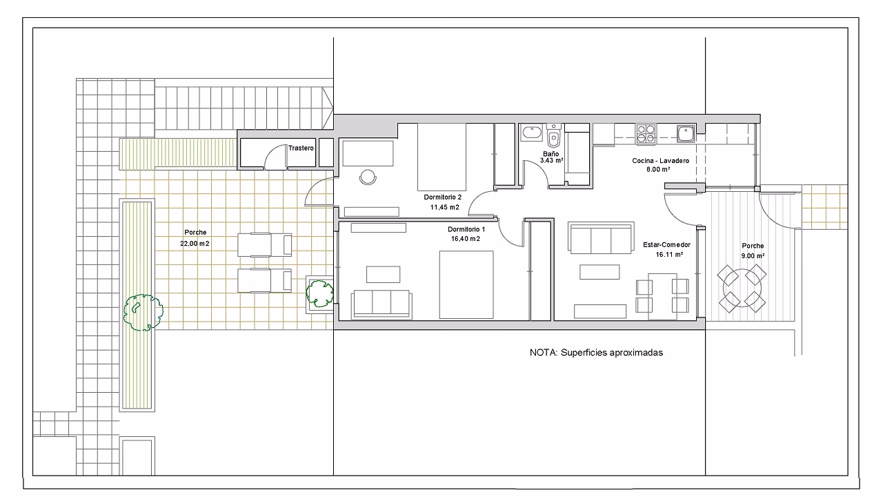 Outside, there is a 9m2 front porch with an awning and a spacious 22m2 rear terrace, perfect for relaxing or enjoying time outdoors, all surrounded by well-maintained communal gardens.