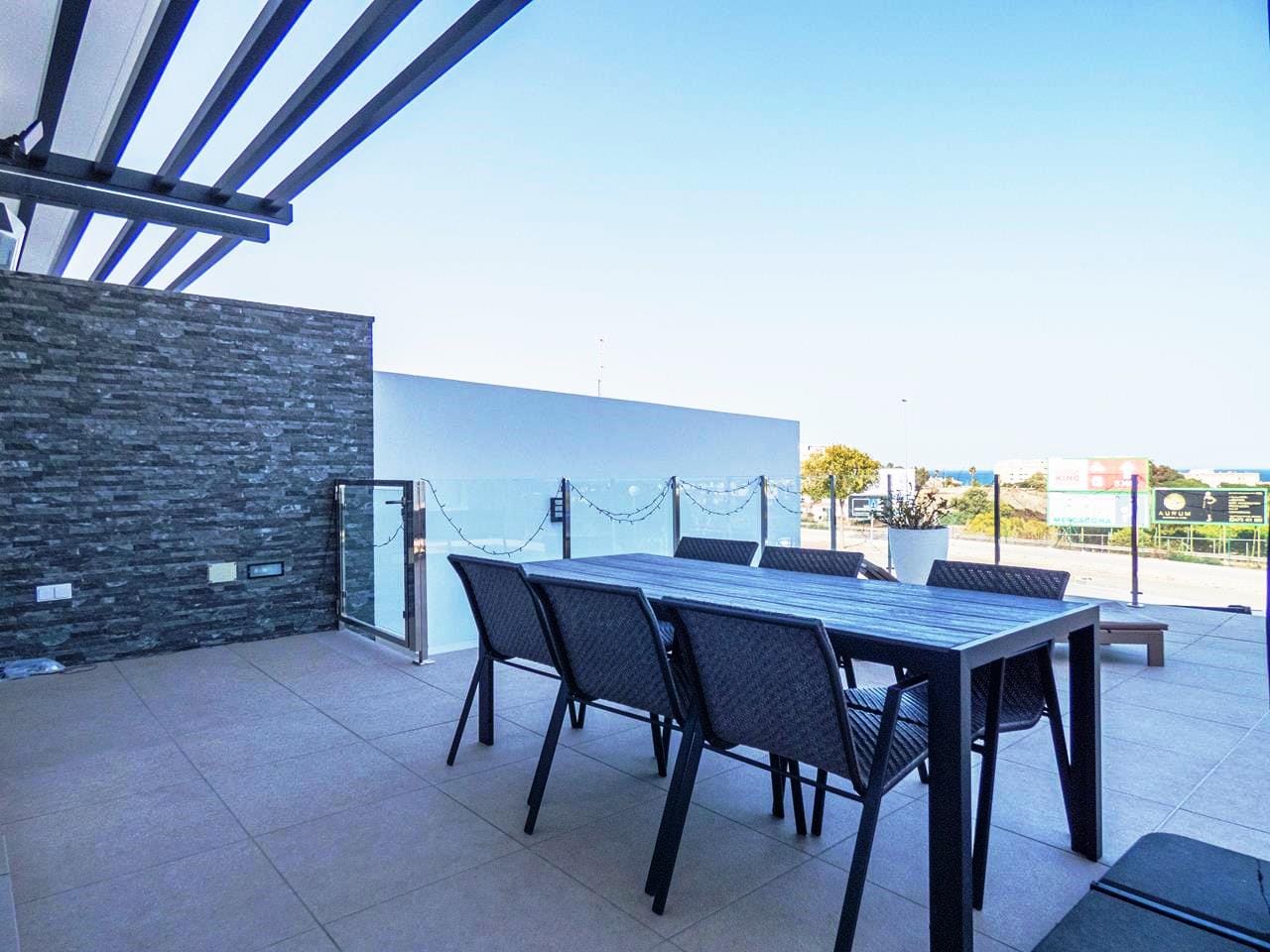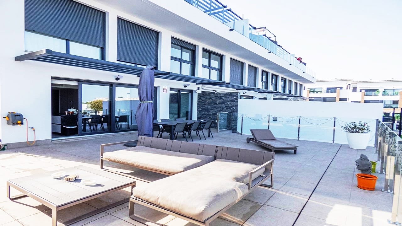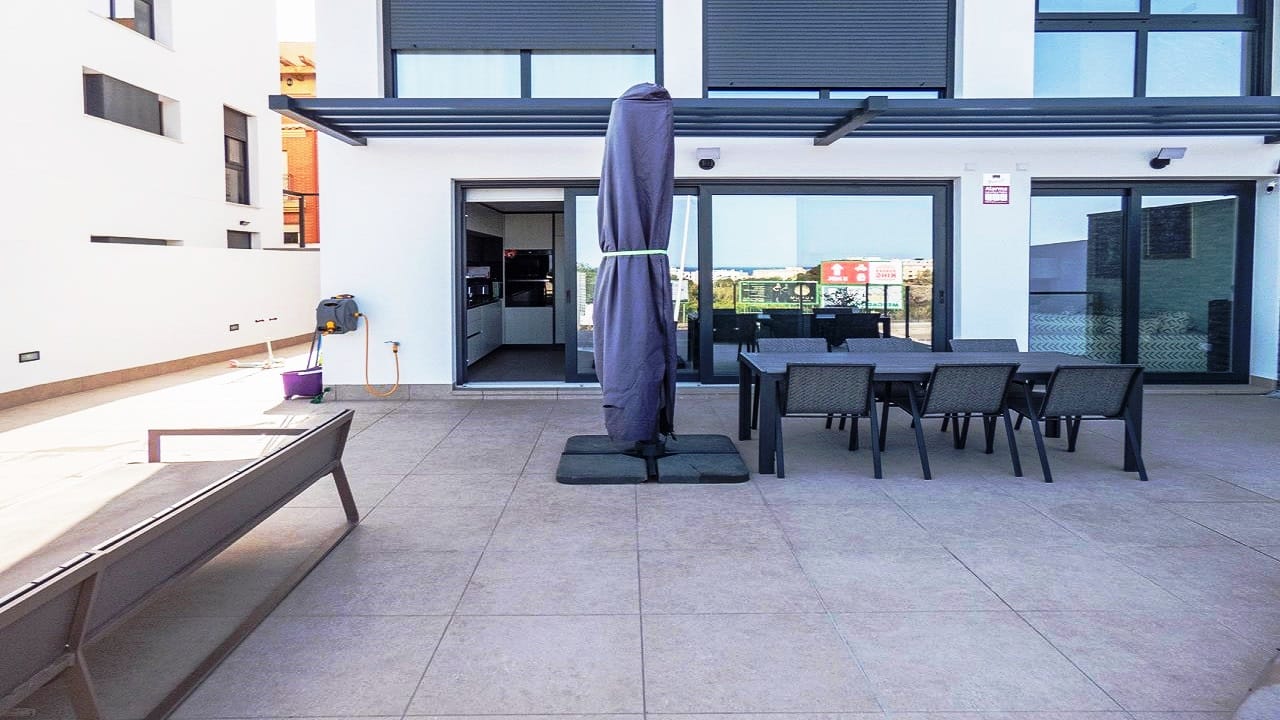 – White Villas In Spain are pleased to offer this FABULOUS GROUND FLOOR DUPLEX APARTMENT on the outskirts of Guardamar. The apartment is less than 2 years old and has an internal build size of 116m2 and has a terrace of 93m2. This amazing apartment offers three large bedrooms, three bathrooms and a very modern open plan style of living with Sea views.
