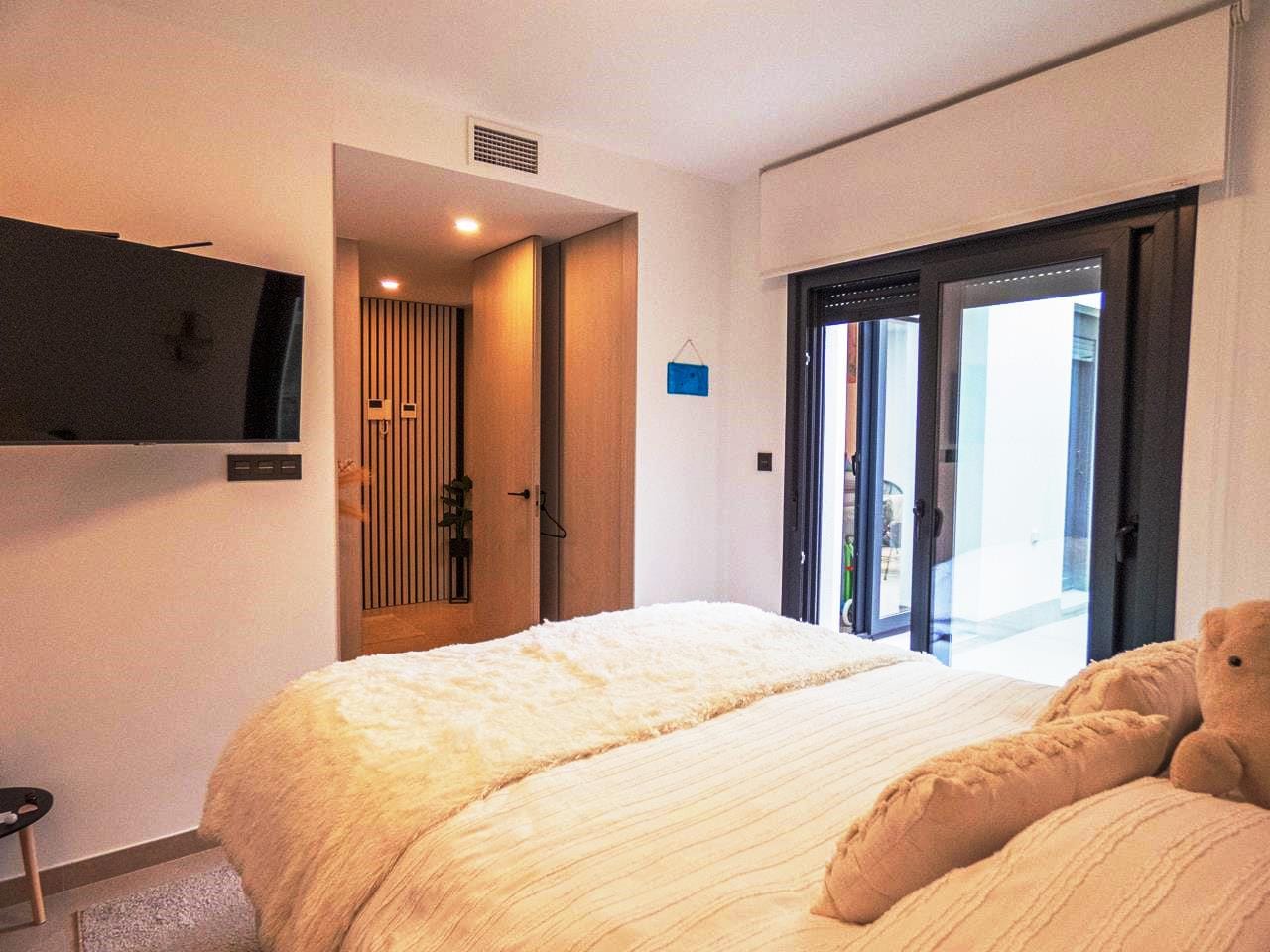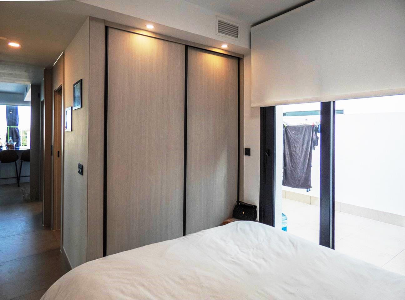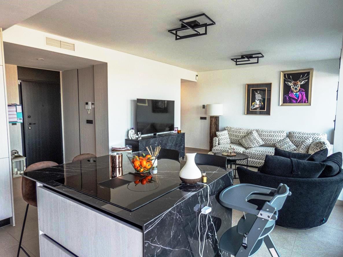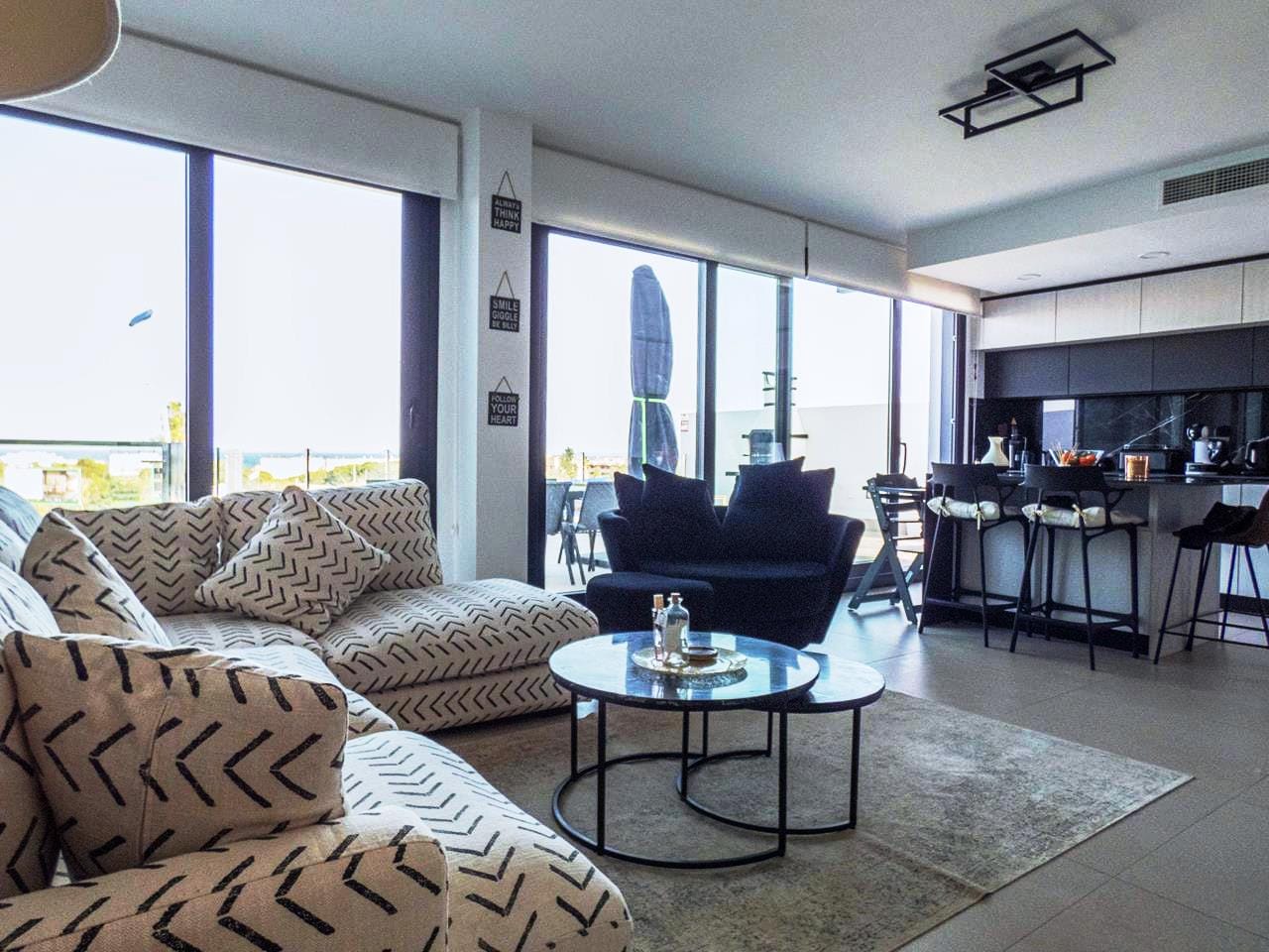 As you walk through the main door into the property, you have small hallway that opens into a large livings space. To your right you have a stunning kitchen that has all the appliances you would expect in a quality property like this. There is an island worktop which provides ample space for preparing your food and acts as a natural divider between the kitchen and the living space. The current owner has created a dining area for family and guests to dine as well as relax and take in the views through the glass sliding doors. If you walk outside, you have a large terrace of 93m2 providing ample room to either relax with a book, top up your tan or take in the amazing views to the sea the choice is yours! If you then walk back inside and towards the main entrance, you have a cloakroom which is always handy when you have guests rounds, this is followed by the first guest bedroom, which has its own en-suite shower room, fitted wardrobes and sliding doors out to the wrap-around terrace.