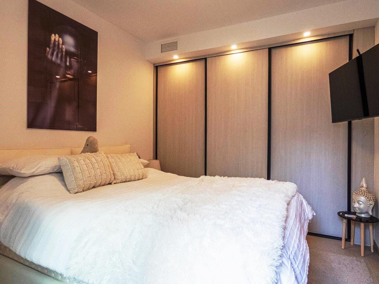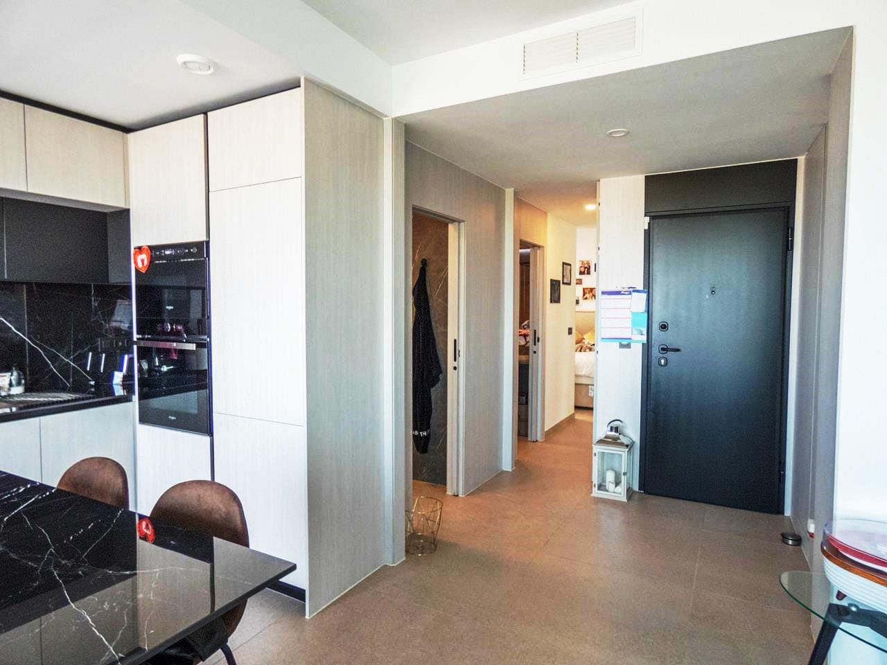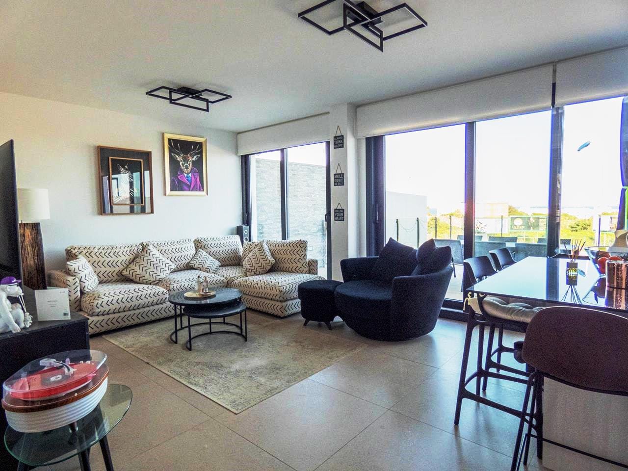 As you walk through the main door into the property, you have small hallway that opens into a large livings space. To your right you have a stunning kitchen that has all the appliances you would expect in a quality property like this. There is an island worktop which provides ample space for preparing your food and acts as a natural divider between the kitchen and the living space. The current owner has created a dining area for family and guests to dine as well as relax and take in the views through the glass sliding doors. If you walk outside, you have a large terrace of 93m2 providing ample room to either relax with a book, top up your tan or take in the amazing views to the sea the choice is yours! If you then walk back inside and towards the main entrance, you have a cloakroom which is always handy when you have guests rounds, this is followed by the first guest bedroom, which has its own en-suite shower room, fitted wardrobes and sliding doors out to the wrap-around terrace.