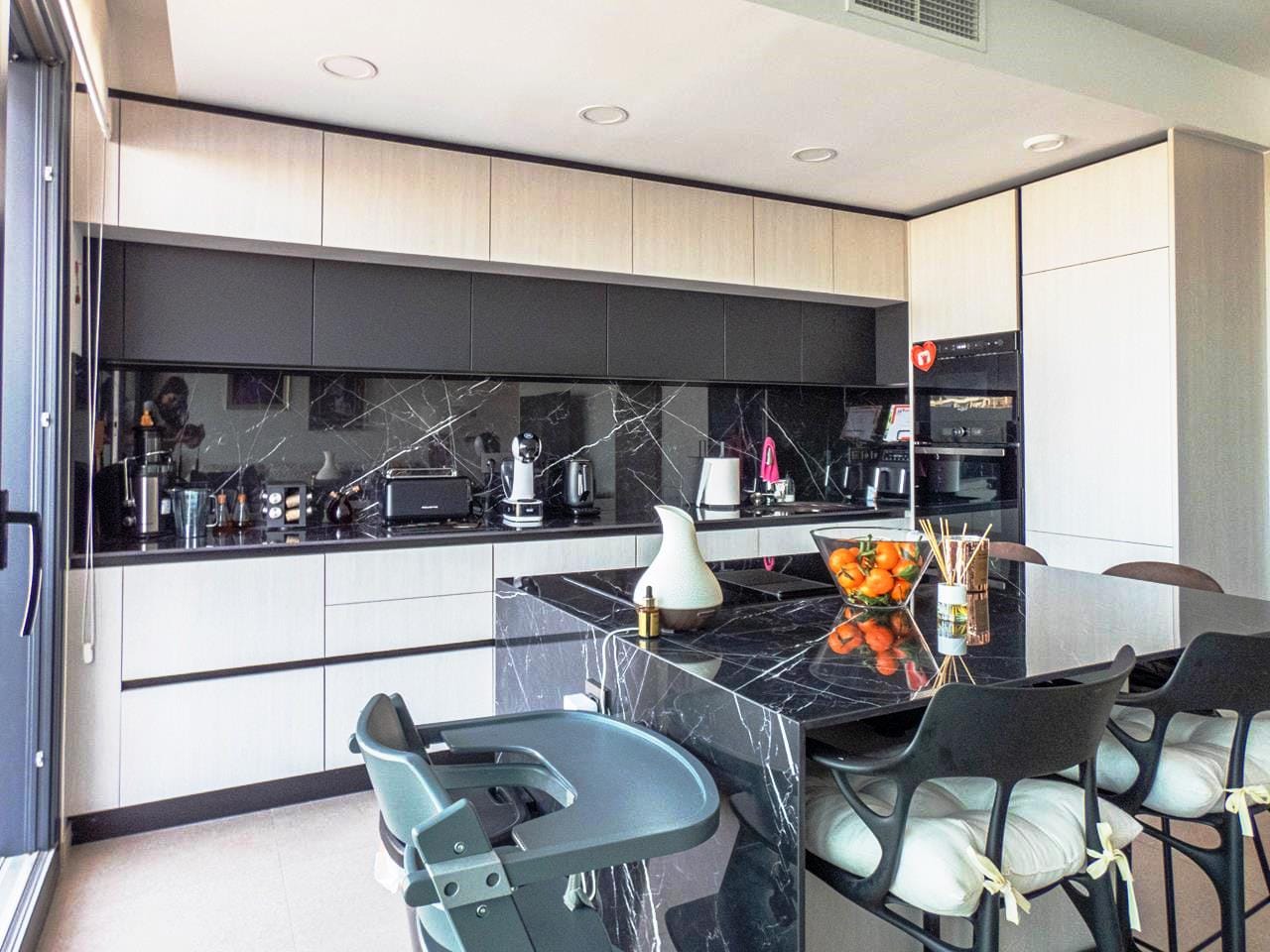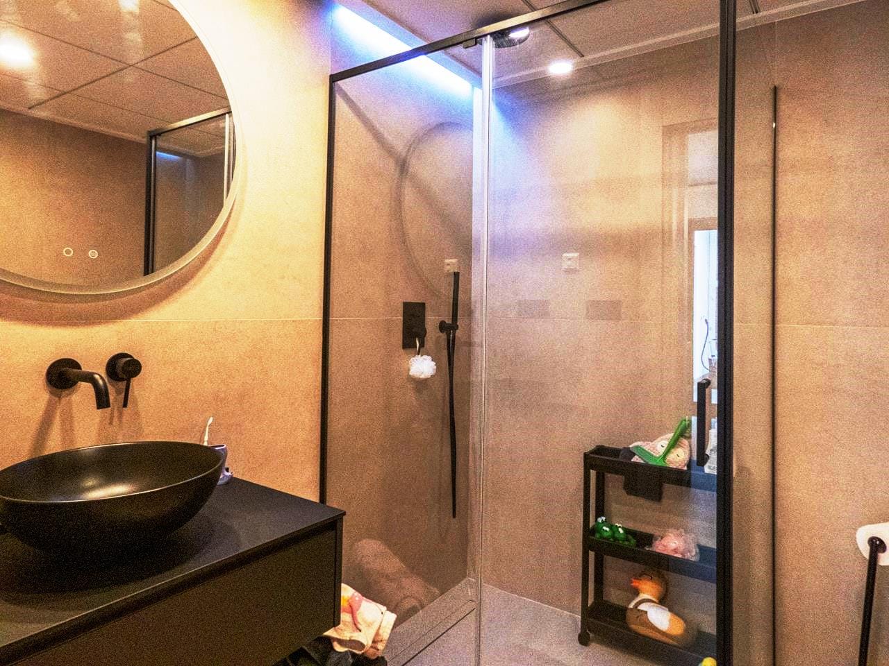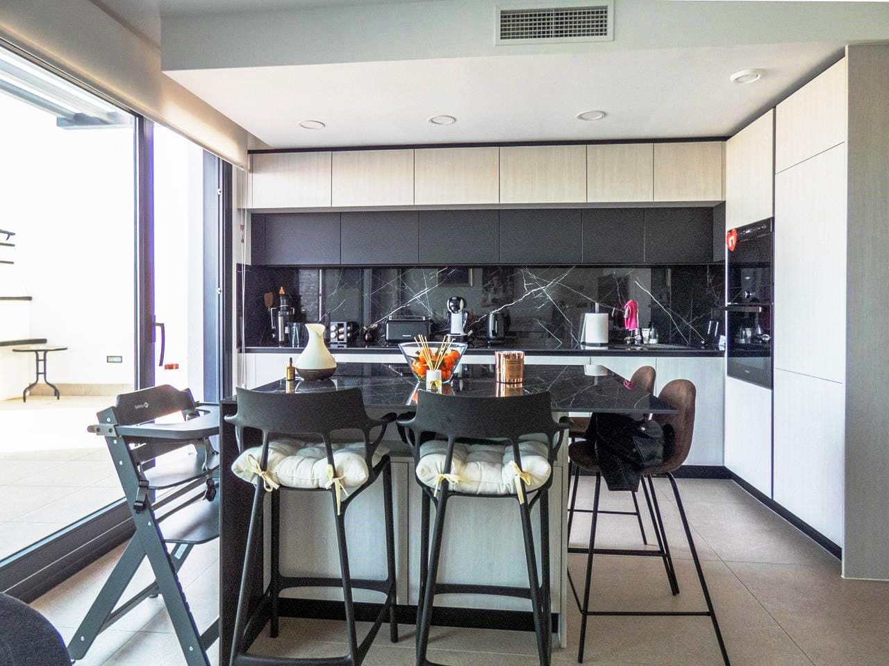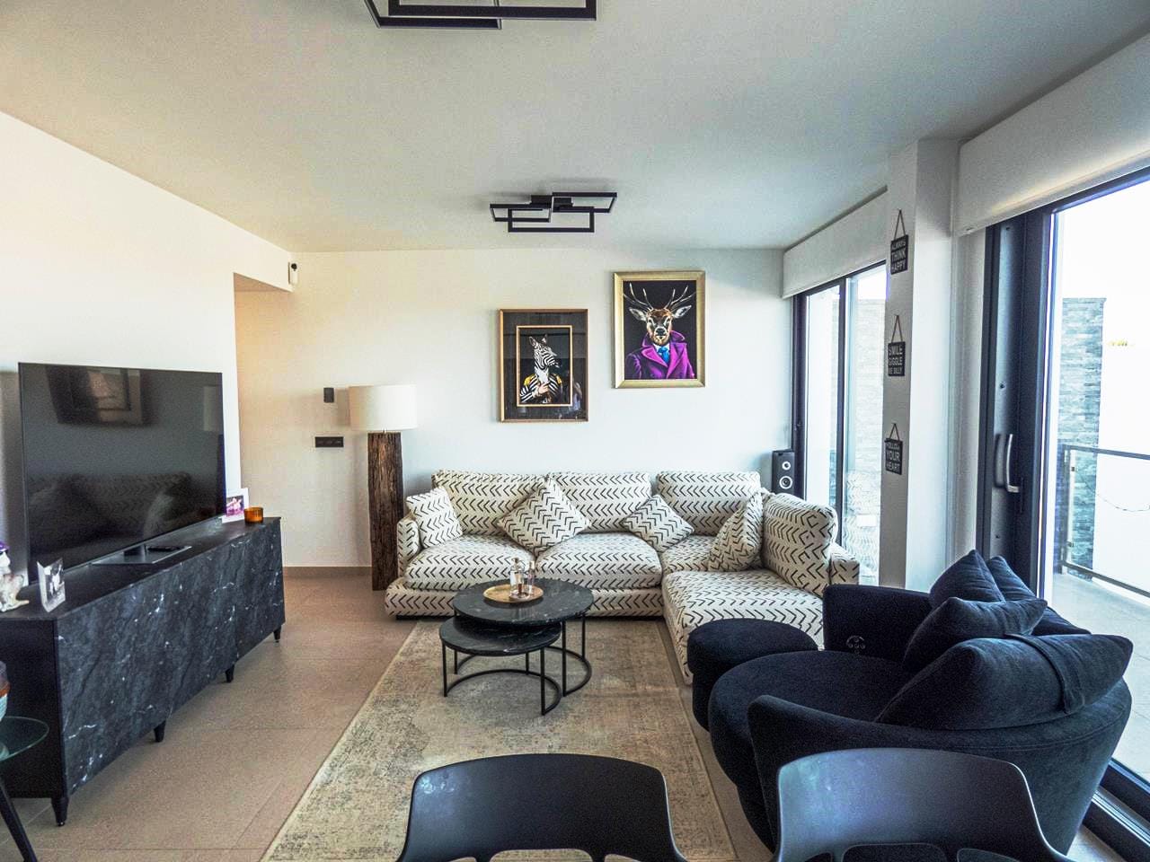 As you walk through the main door into the property, you have small hallway that opens into a large livings space. To your right you have a stunning kitchen that has all the appliances you would expect in a quality property like this. There is an island worktop which provides ample space for preparing your food and acts as a natural divider between the kitchen and the living space. The current owner has created a dining area for family and guests to dine as well as relax and take in the views through the glass sliding doors. If you walk outside, you have a large terrace of 93m2 providing ample room to either relax with a book, top up your tan or take in the amazing views to the sea the choice is yours! If you then walk back inside and towards the main entrance, you have a cloakroom which is always handy when you have guests rounds, this is followed by the first guest bedroom, which has its own en-suite shower room, fitted wardrobes and sliding doors out to the wrap-around terrace.