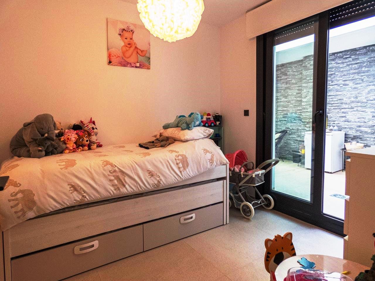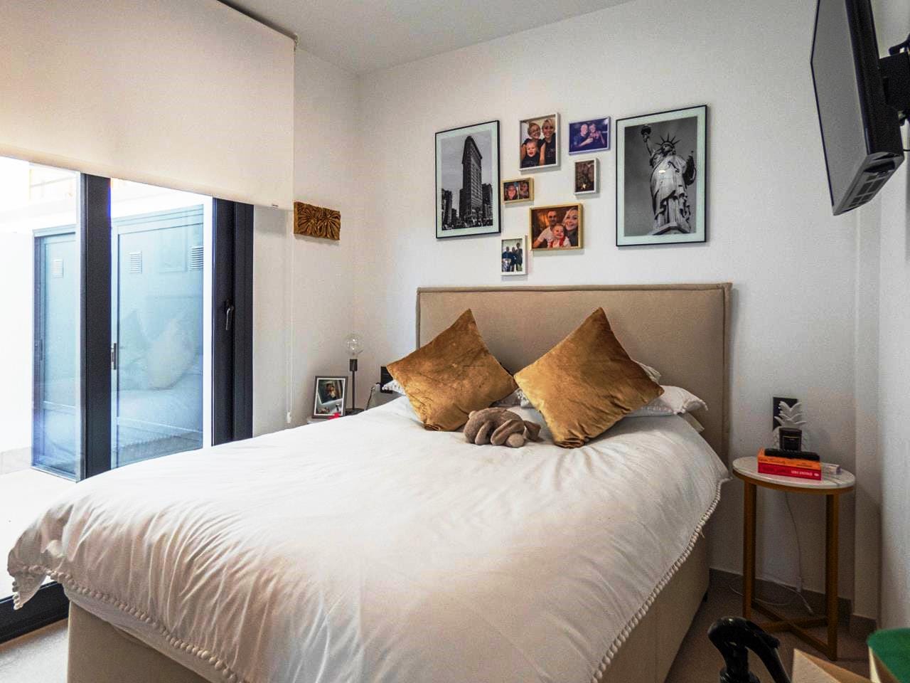 Moving back to the living area, you have a stairs that take you down to the lower level to another small hallway, where you have a door that provides access out and round to a double garage. The hallway also provides access to the second guest bedroom, which has its own en-suite shower room and fitted wardrobes, this is then followed by the largest of the three bedrooms and which we would class as the master bedroom, which also has fitted wardrobes and a private en-suite. Both bedrooms have access out to a lower terrace, from where you have access to the back of the garage. This amazing property is just a short walk from the communal pool which is at the left of the property.